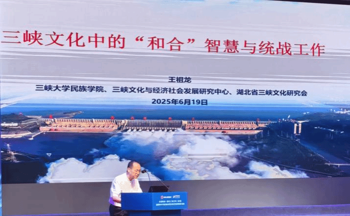 (通讯员 张姗)2025年6月19日,由中共湖北省委统战主办,中共宜昌市委统战承办的统战文化博览汇东湖论坛·遇见三峡文化(宜昌)”暨铸牢中华民族共同体意识宣传教育活动在宜昌举行。中心主任、湖北省三峡文化研究会会长王祖龙教授应邀为活动作了《三峡文化中的“和合”智慧与统战工作》的主旨报告。该报告从三峡文化的内涵及其统战价值、三峡文化符号的价值魅力等方面,深刻阐释了三峡文化的“和合”智慧对新时代统战工作的意义。